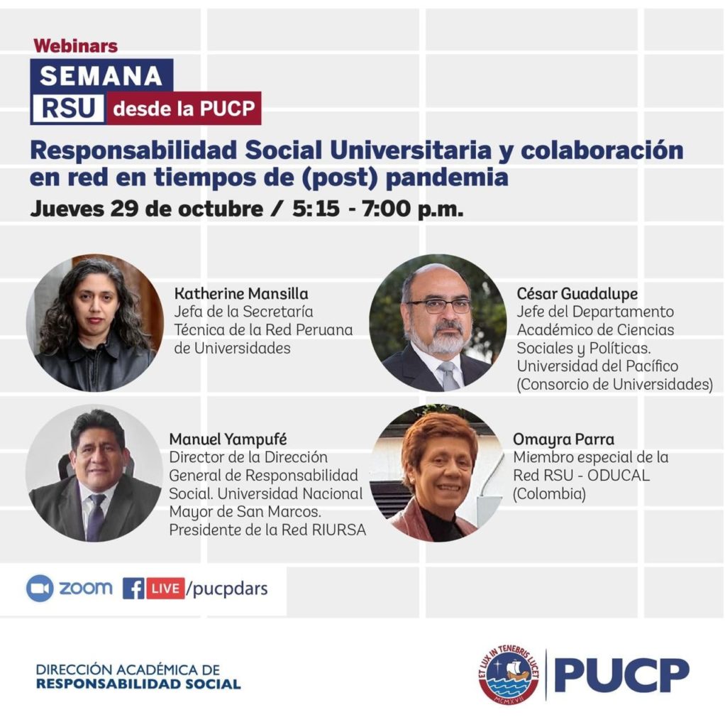La RPU los invita a participar del webinar que se realizará el día jueves 29 de octubre de 5:15 a 7:00PM. Este webinar se enmarca en la “Semana RSU de la PUCP” organizado por la Dirección Académica de Responsabilidad Social – PUCP (DARS) y busca ser un espacio de diálogo prospectivo, mirando hacia el futuro, sobre cómo la pandemia y las crisis que vinieron con ella afectan el rol de la universidad en su relación con el entorno, desde la experiencia de las redes de colaboración interuniversitaria y con énfasis en las acciones de Responsabilidad Social Universitaria.