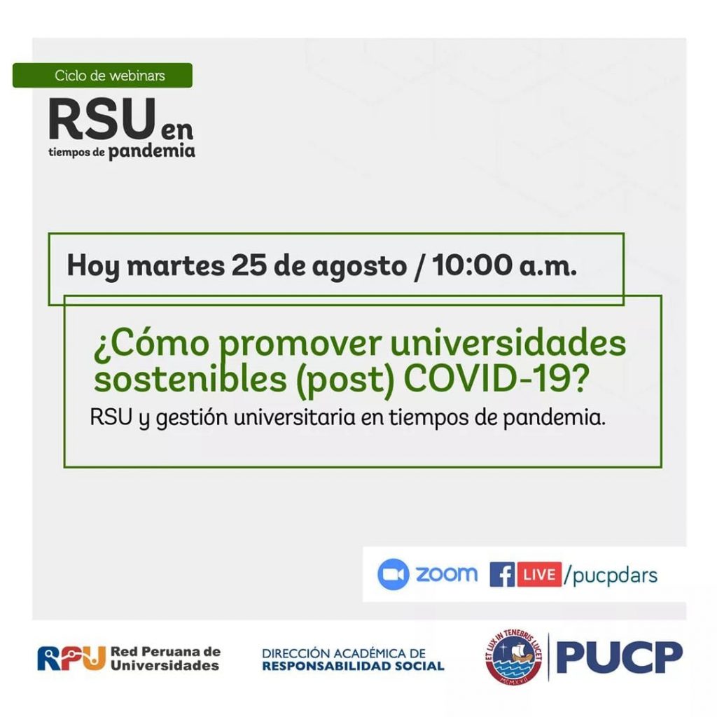 El martes 25 de agosto ⏰ 10:00 a.m. participa en el webinar ?¿Cómo promover universidades sostenibles (post) COVID-19? RSU y gestión universitaria en tiempos de pandemia.